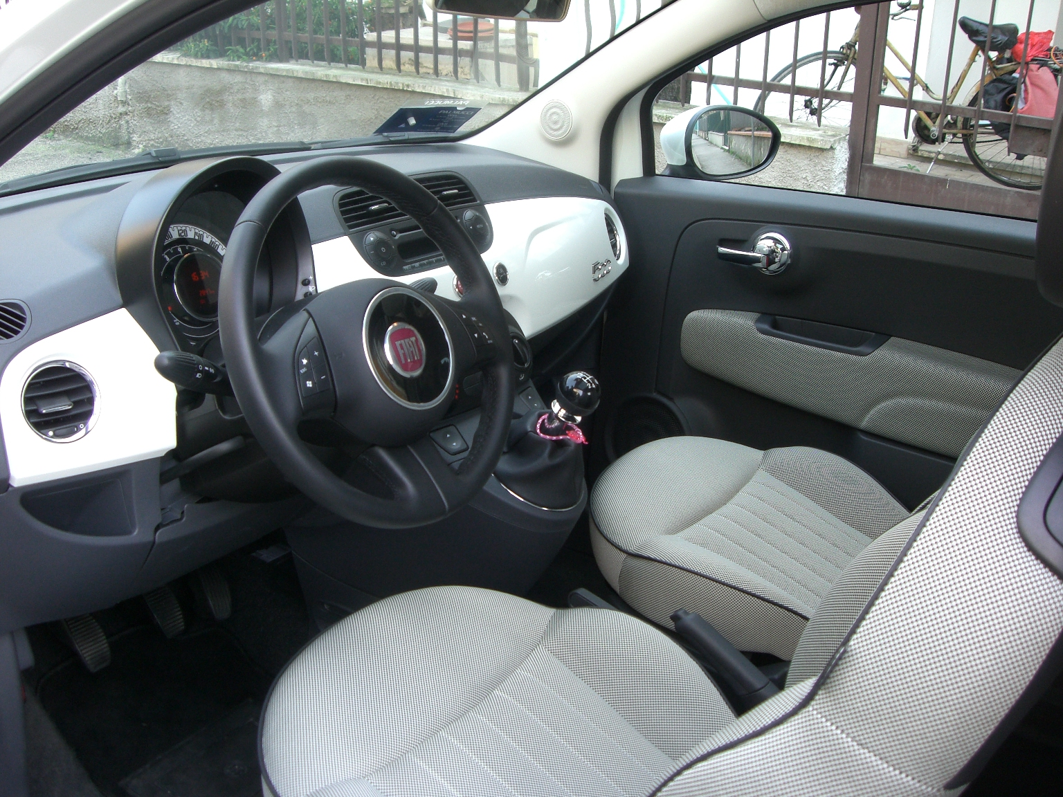 A-Bar Modanatura cromata su cofano Climatizzatore manuale Kit cromo Tetto in vetro fisso con tendina parasole Specchio interno antiabbagliamento automatico giorno/notte Sistema audio HiFi Interscope Sound System con subwoofer amplificato da 100W Sistema Blue&Me Fasce paracolpi in colore vettura con targhetta "500" Paraspruzzi posteriori Tappeti in moquette cucitura nero bordo nero Appendigiacca avorio Gancio traino estraibile |