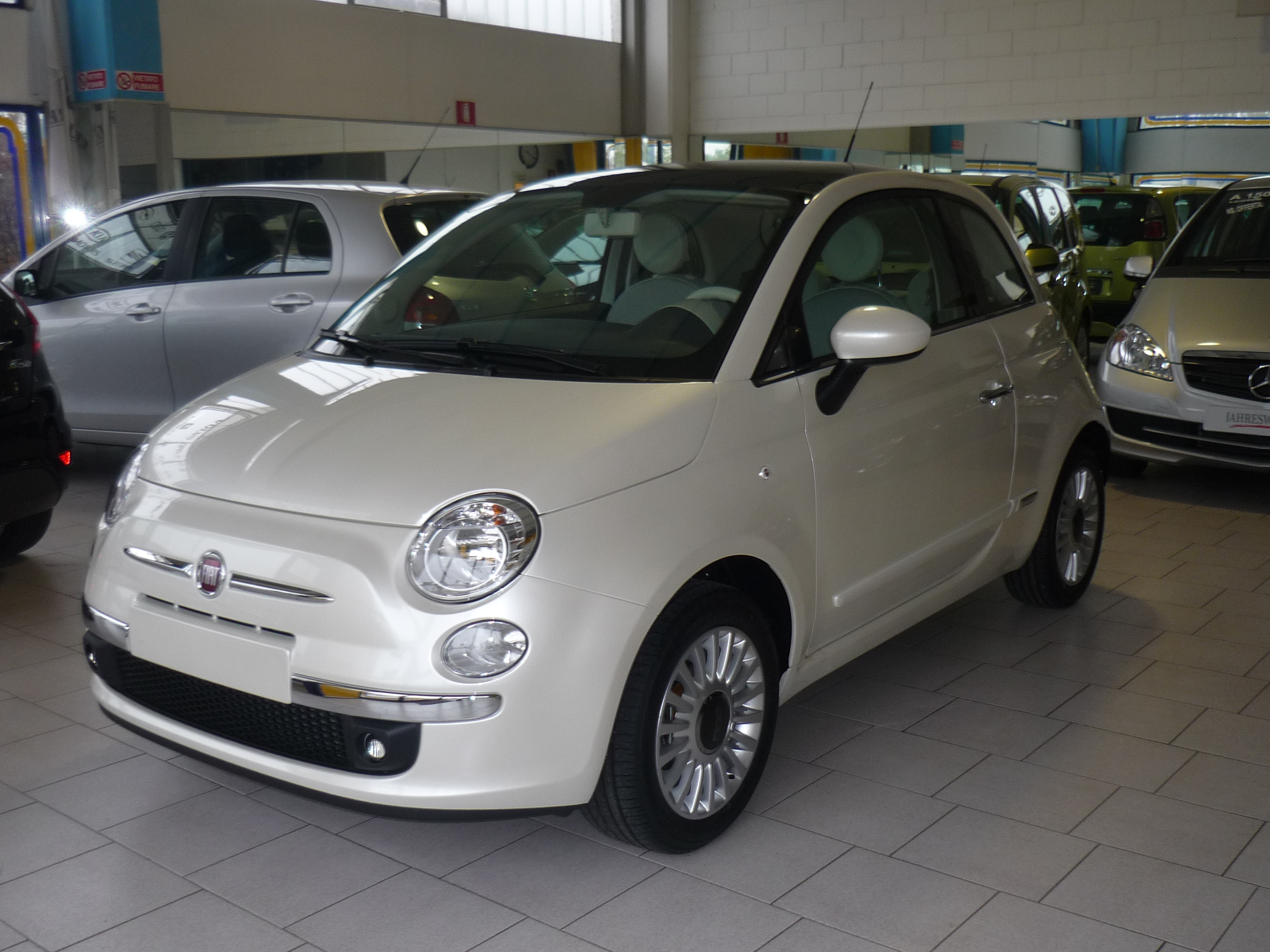 Fendinebbia Climatizzatore manuale Kit cromo Tetto in vetro fisso con tendina parasole Sistema Blue&Me Fasce paracolpi in colore vettura con targhetta "500" Pomello leva cambio in pelle ESP+ASR, MSR, HBA e Hill Holder |